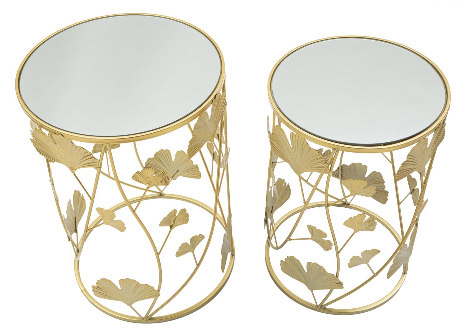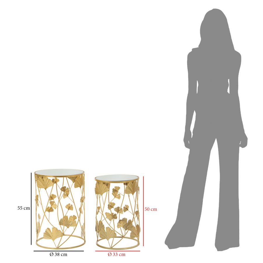 Breng een vleugje verfijning in je interieur met onze Elegance Leaf Bijzettafel Set van Luxe-Casa. Deze set van twee elegante ronde tafels is perfect voor elke ruimte die een beetje glamour kan gebruiken. De tafels zijn uitgevoerd in goudkleurig metaal met een spiegelend glazen blad, waardoor ze zowel functioneel als decoratief zijn. Het unieke ontwerp, met een decoratieve bladerenstructuur, voegt een bijzondere charme toe aan je woning. Specificaties: Materiaal: Goudkleurig metaal en spiegelend glas Kleuren: Goud en spiegelend Afmetingen: Ø 38 cm x H 55 cm (grote tafel), Ø 33 cm x H 50 cm (kleine tafel) Design: Elegante bladeren decoratie Set van: 2 tafels Maak je interieur compleet met deze betoverende tafels die niet alleen praktisch zijn, maar ook een statement maken in elke ruimte. Voeg een vleugje luxe toe aan je woonkamer of slaapkamer met de Elegance Leaf Bijzettafel Set van Luxe-Casa.