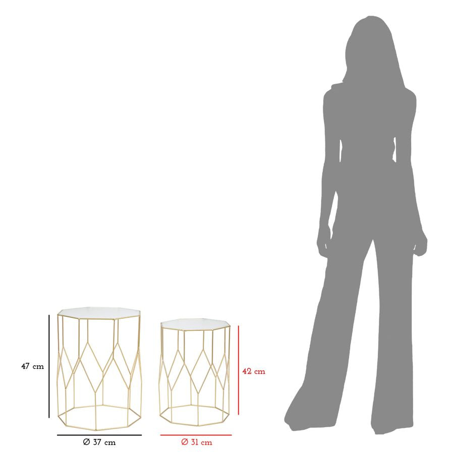 Til je interieur naar een hoger niveau met de Luxe Octa Geo Tafelset van Luxe-Casa. Deze set van twee achthoekige tafels valt op door het gouden metalen frame met geometrische lijnen en de verfijnde glazen tafelbladen. Een moderne touch voor elke ruimte! Specificaties: Materiaal: Gouden metaal met glazen tafelblad Kleur: Goud Afmetingen: Grote tafel: Ø 37 cm, hoogte 47 cm Kleine tafel: Ø 31 cm, hoogte 42 cm Ontwerp: Achthoekige tafels met geometrische lijnen voor een gevoel van diepte Aantal: 2 tafels per set Voeg een vleugje luxe en stijl toe aan je woonruimte met de Luxe Octa Geo Tafelset!